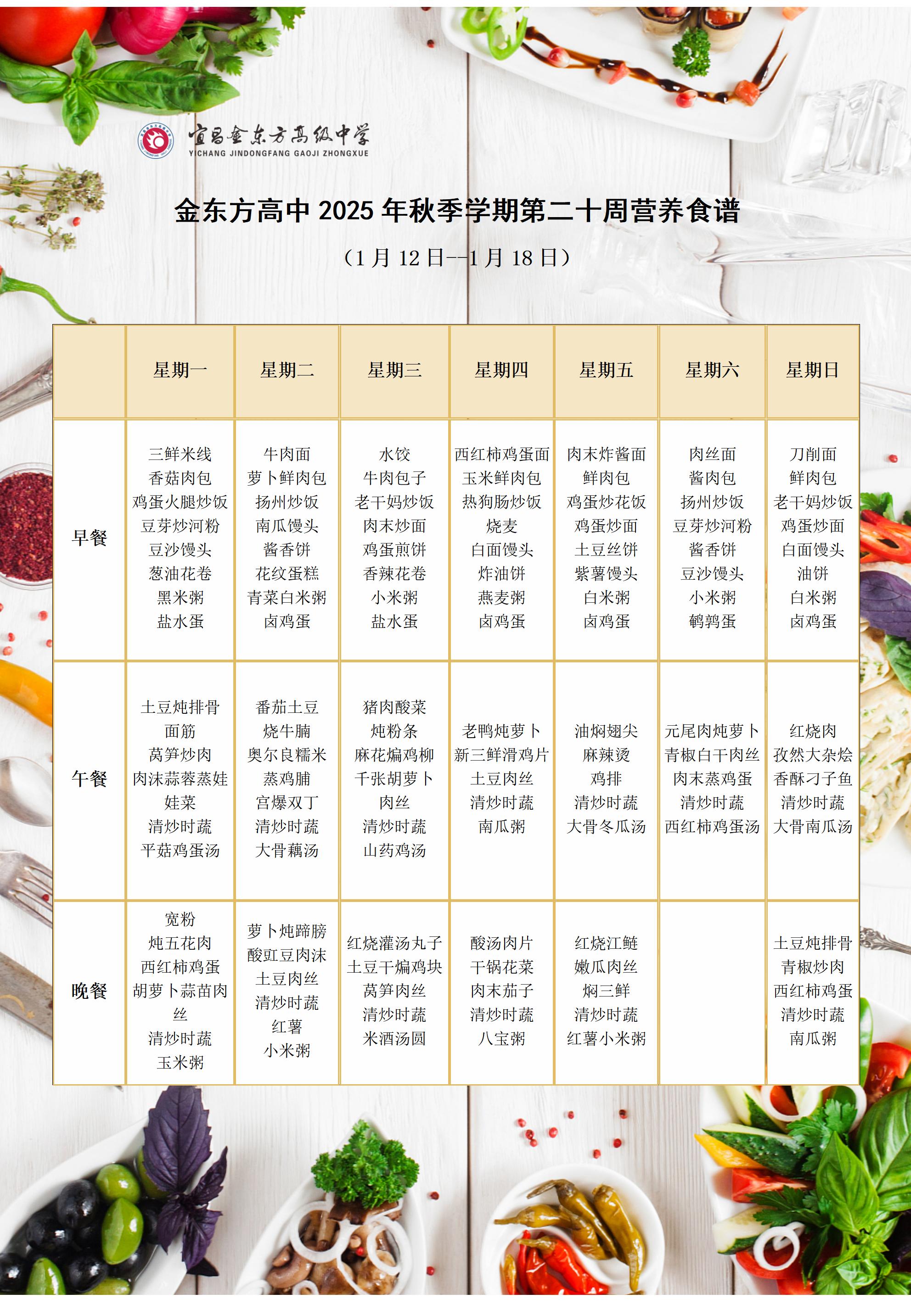 金东方高中2025年秋季学期第二十周营养食谱