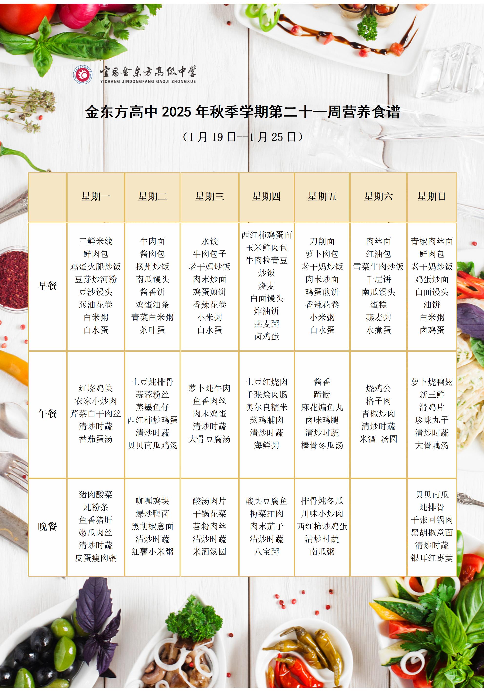 金东方高中2025年秋季学期第二十一周营养食谱