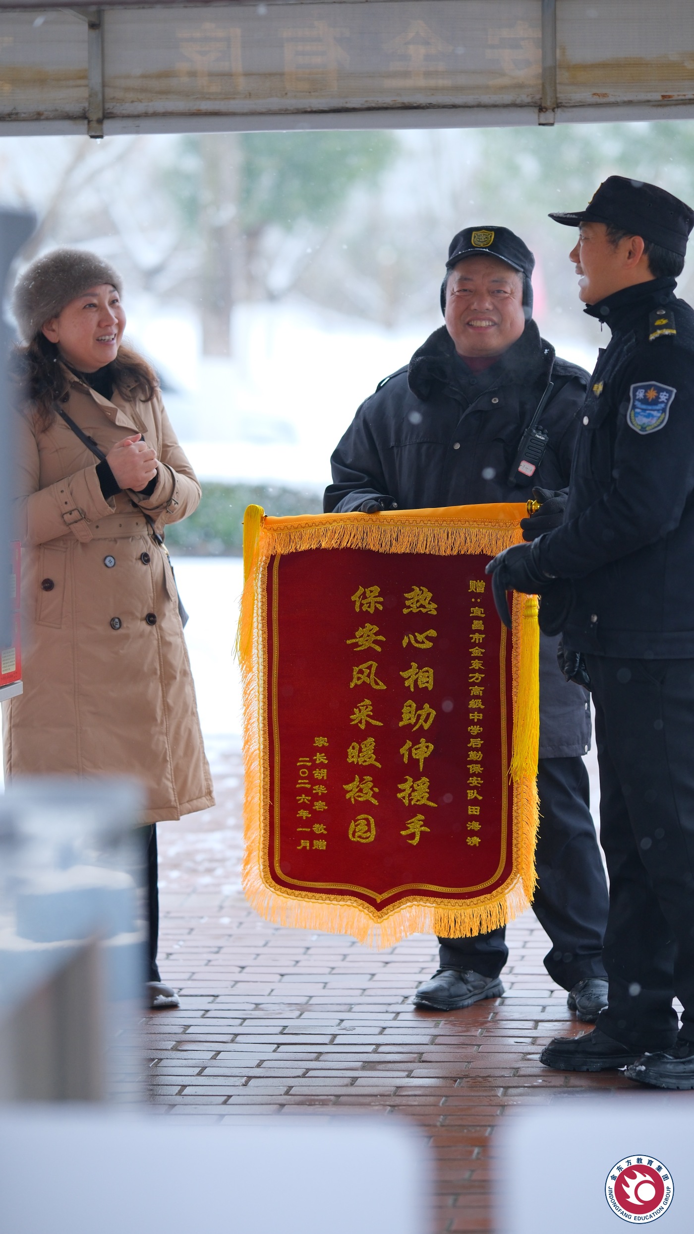 瑞雪漫天而至,校园内寒意阵阵,却总有暖心举动为冬日添温。1月16日,金东方高中一名学生因脚伤行动不便,滞留于宿舍楼内。就在学生与家长焦急无措之时,校园保安田海清师傅主动伸出援手,稳稳背起体重约150斤的学生,一步步小心下楼,随后驾驶校园巡逻车,将其安全送达校门口,亲手交至家长手中。这份雪中送炭的相助,令家长感动不已。近日,家长专程来到学校,送上一面印着“保安风采暖校园 热心相助伸援手”的锦旗致谢。