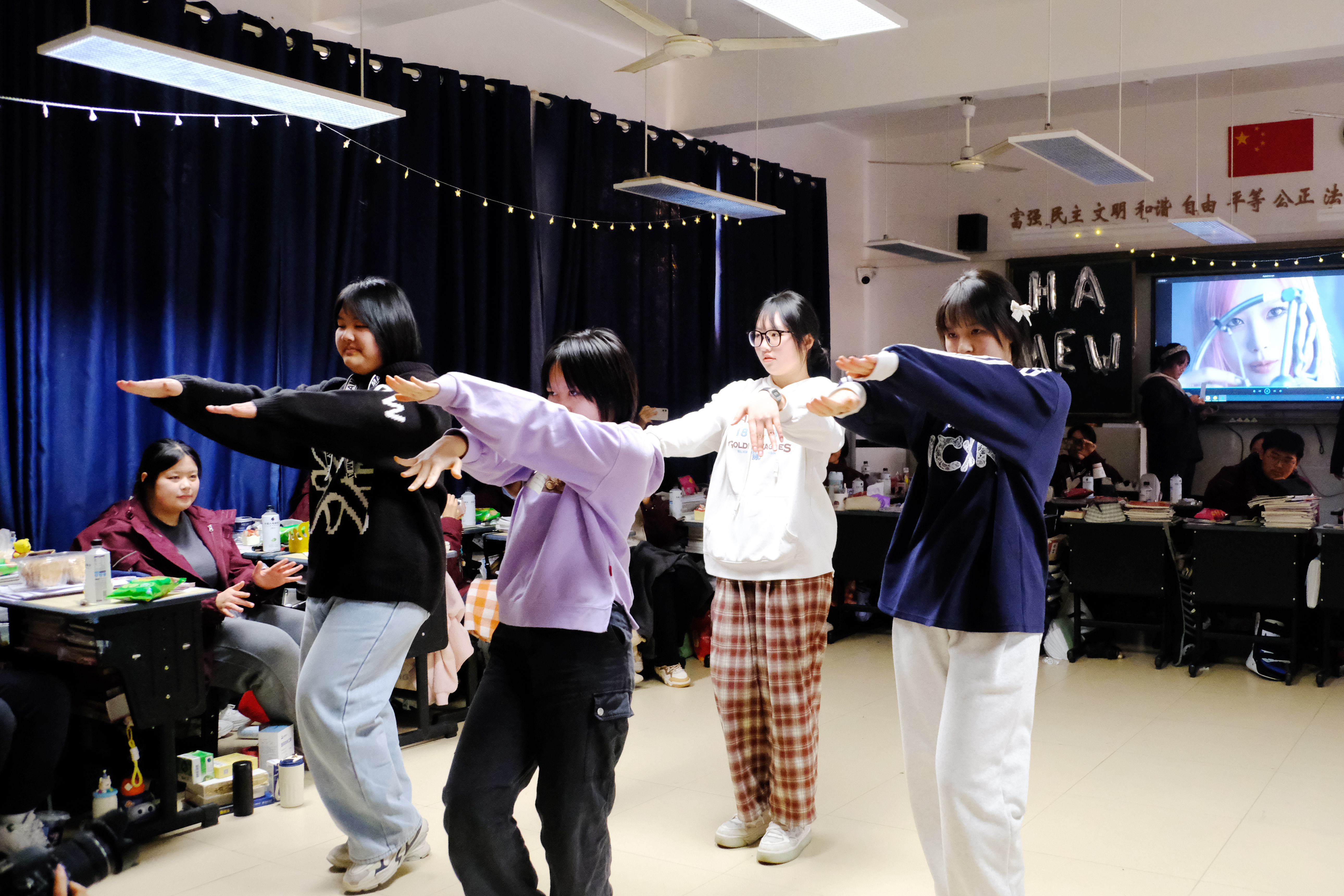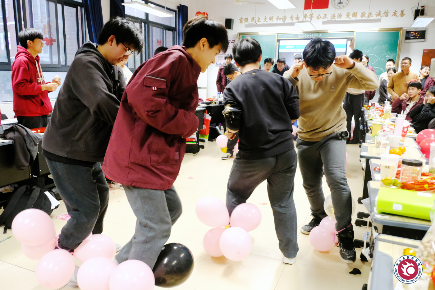 为营造浓厚的节日氛围,各班级精心布置教室,彩灯、气球、拉花等装饰将教室装扮得温馨而喜庆。同学们热情高涨,发挥各自特长,精心编排了丰富多彩的节目,还穿插了多个互动游戏环节,师生共同参与,在游戏中增进了彼此的了解和情谊。