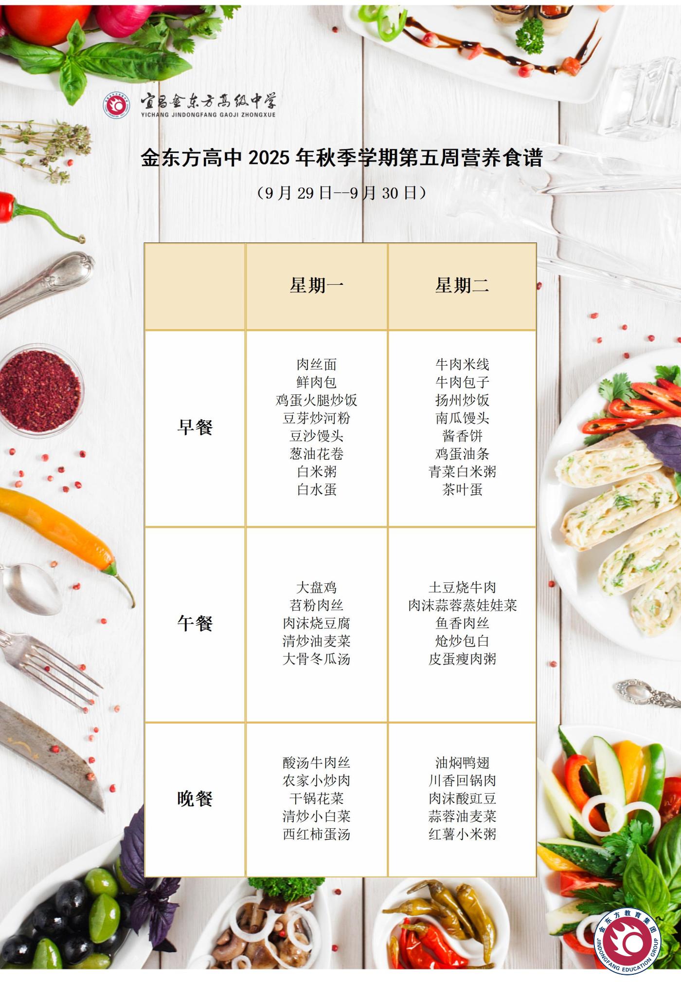 金东方高中2025年秋季学期第五周营养食谱