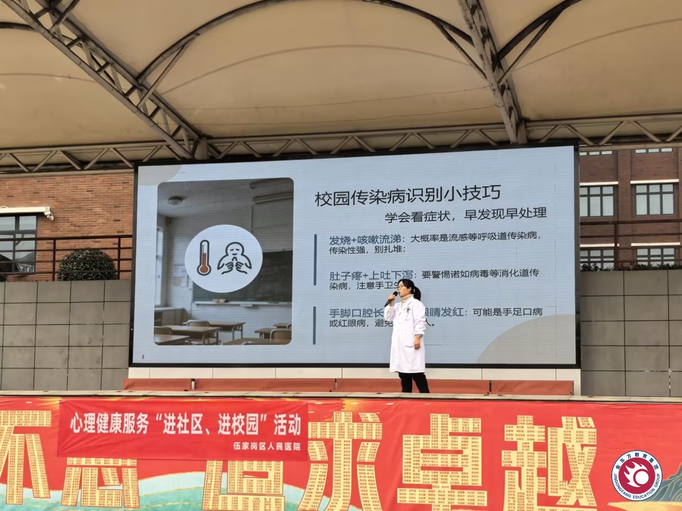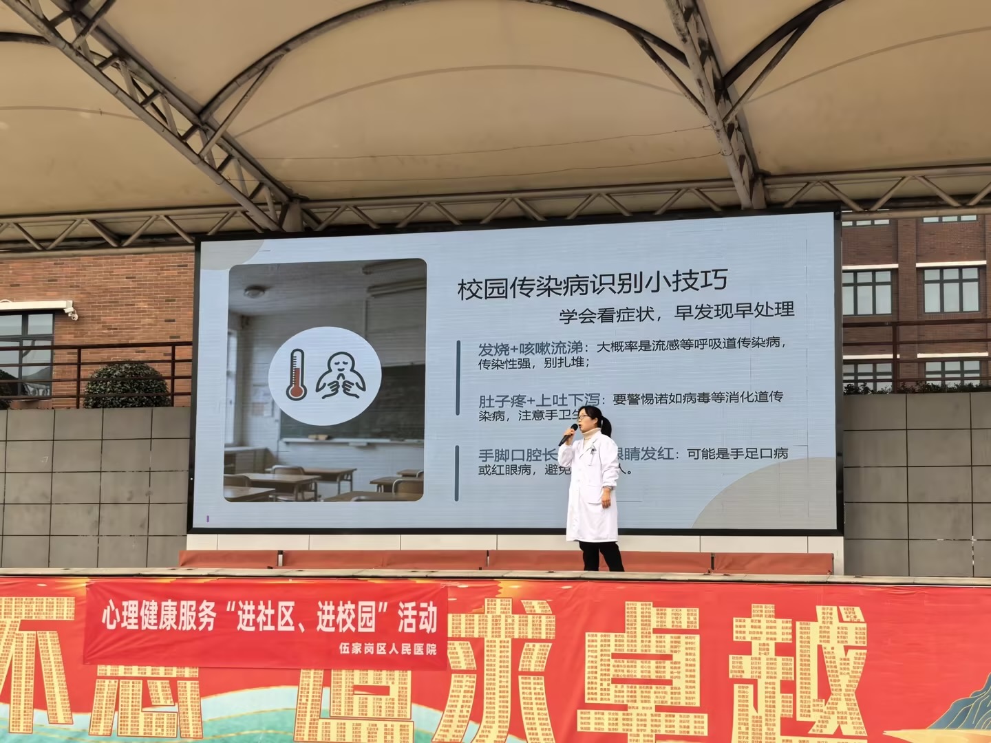讲座中,谢医生结合流感、诺如病毒等冬春季常见传染病的流行特点,用通俗语言讲解其传播途径、典型症状和科学防控要点,重点强调通风、洗手等日常防护措施的重要性,并通过案例树立师生 “早预防、早发现、早处置” 的健康意识。讲座结束后,伍家医院的医生们为学生发放了传染病预防知识、疫苗接种等内容的宣传册,方便大家查阅学习。