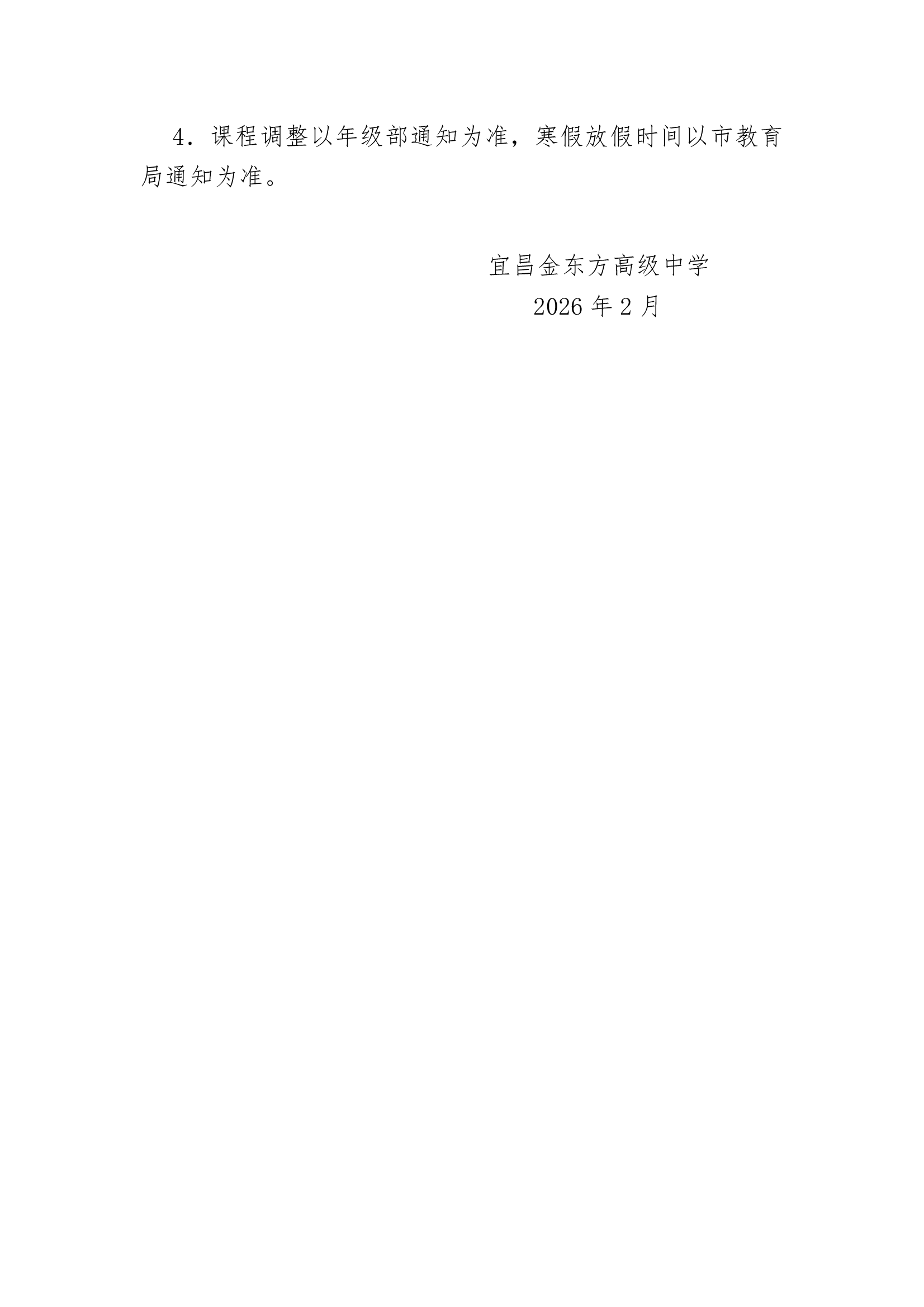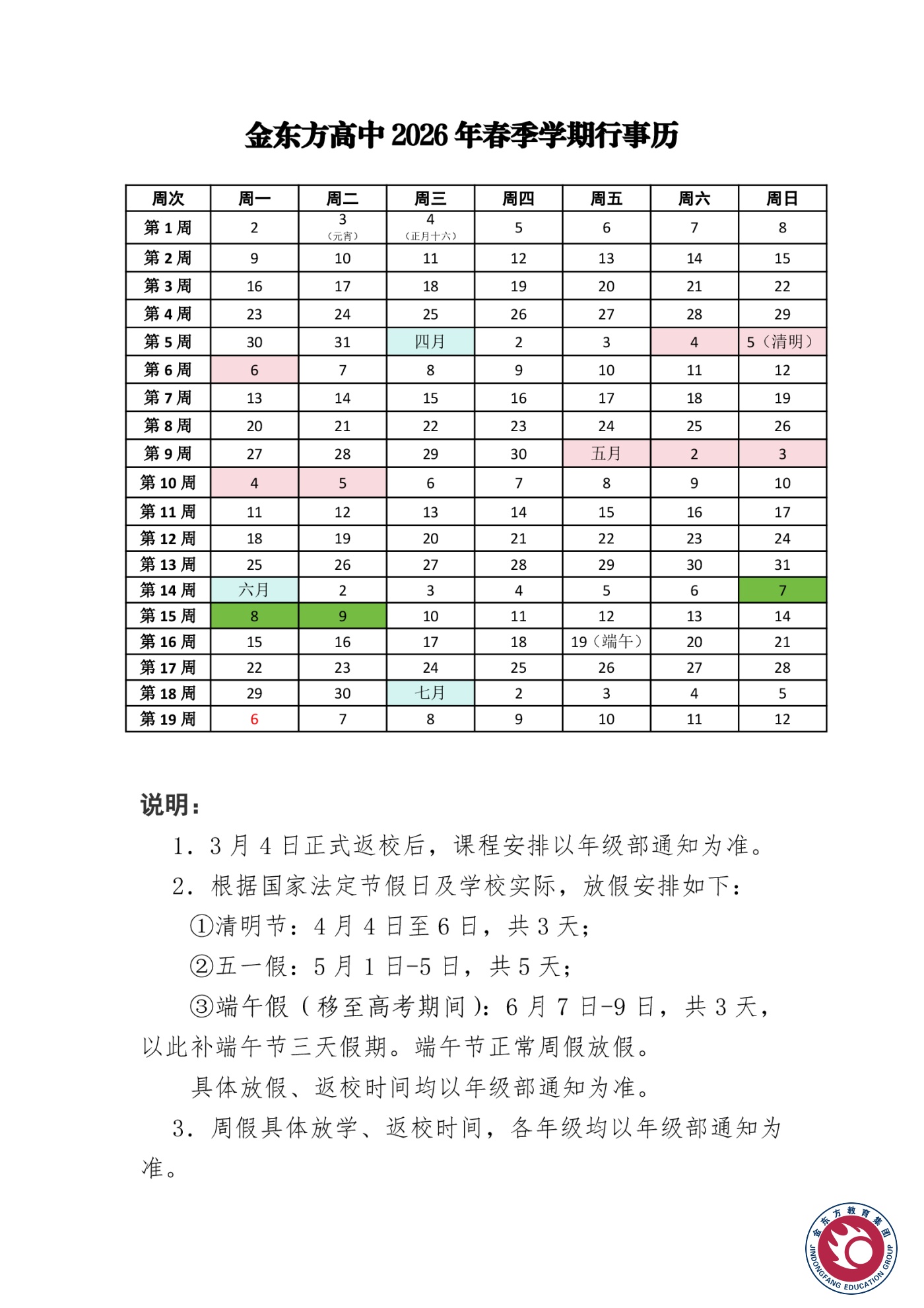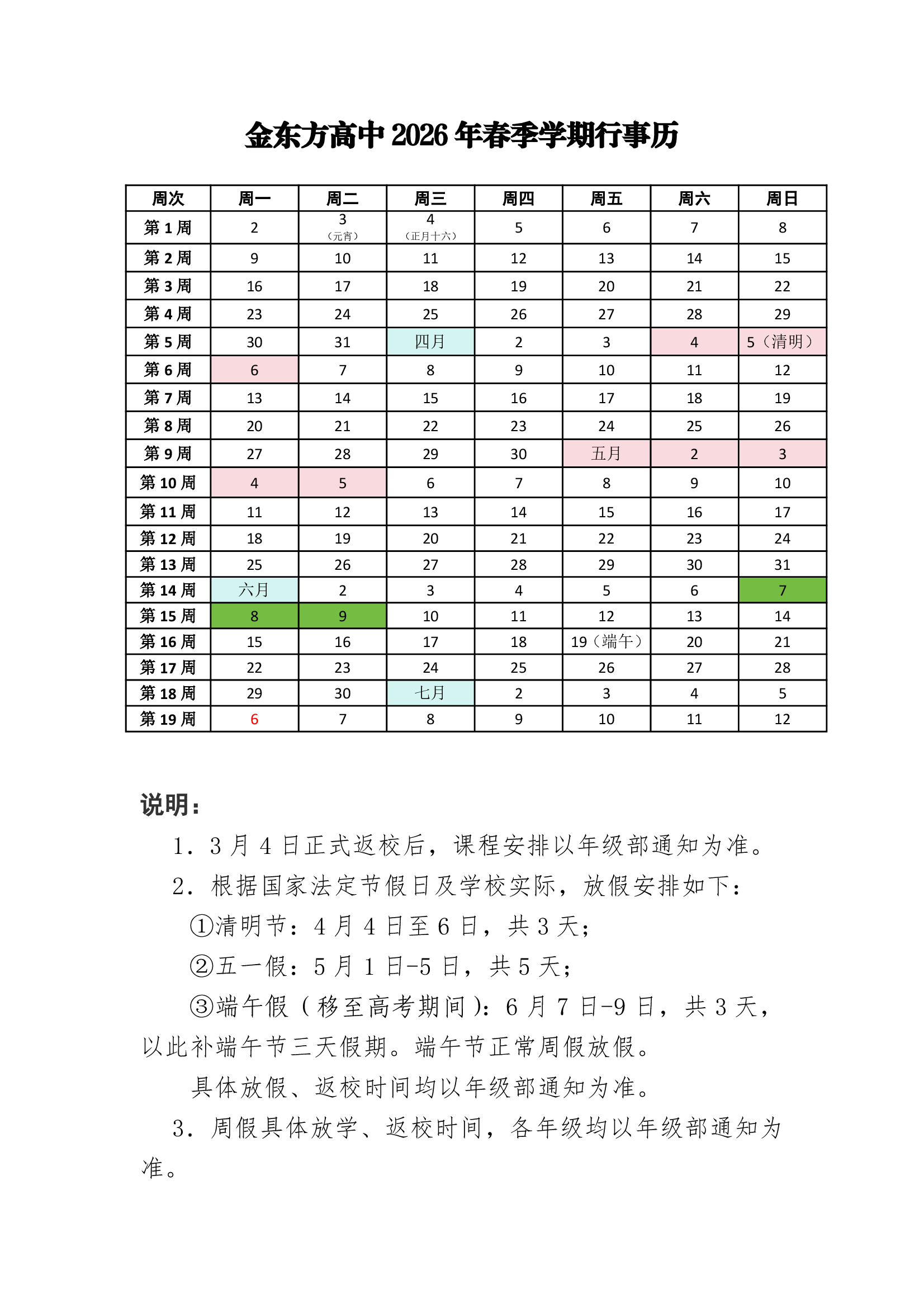 金东方高中2026年春季学期行事历
