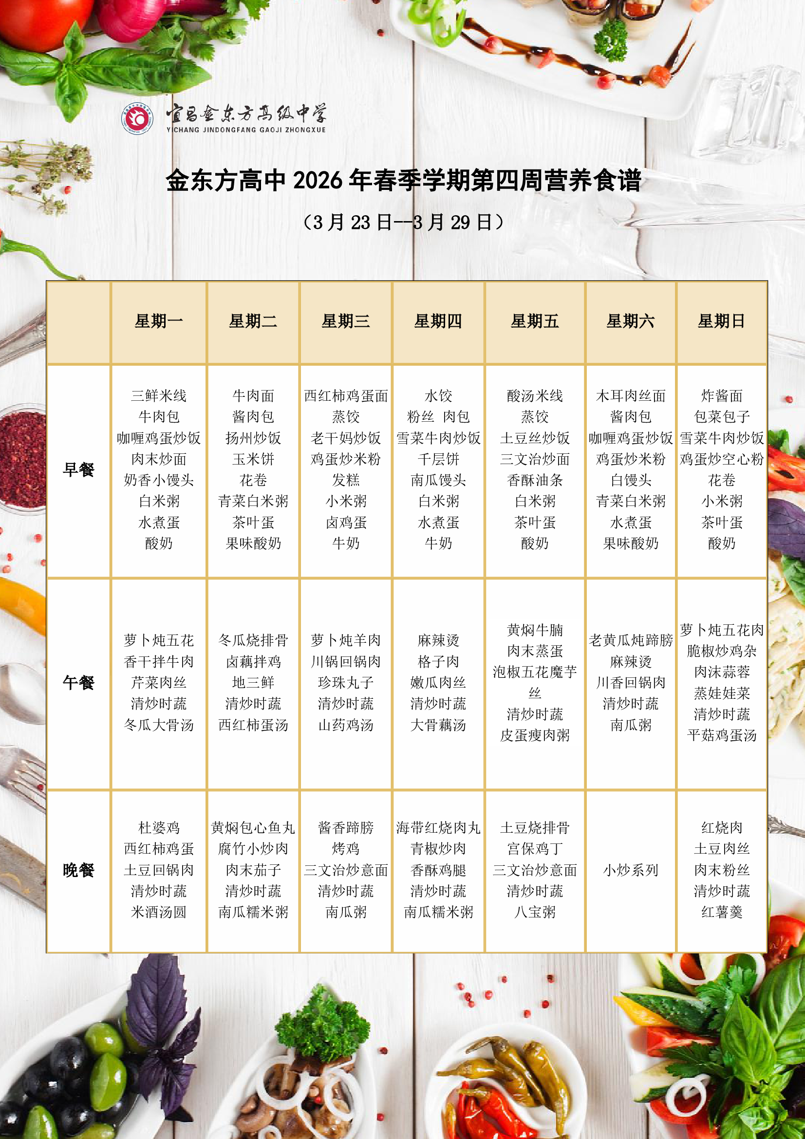 金东方高中2026年春季学期第四周营养食谱