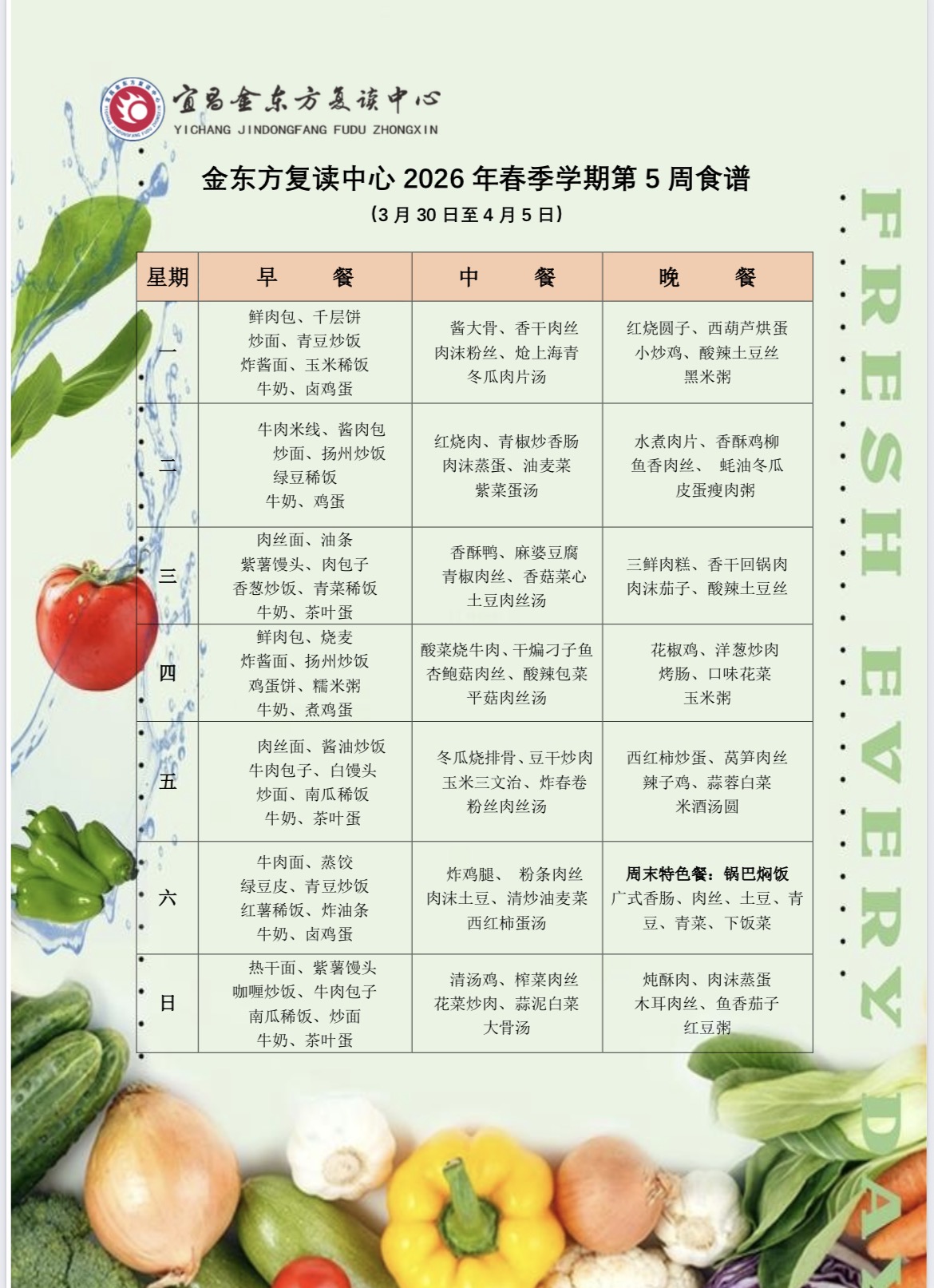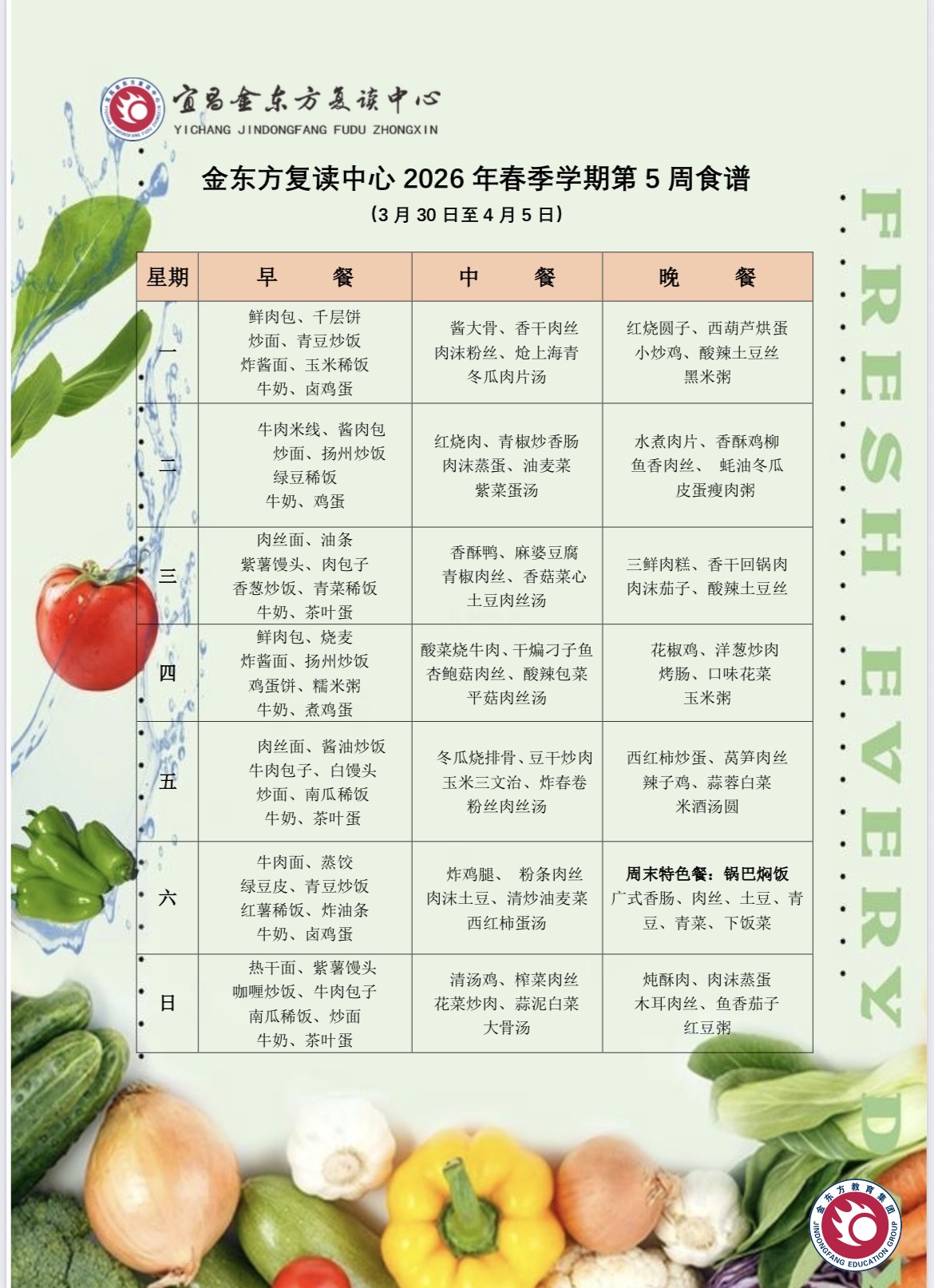 复读中心2026年春季学期第五周营养食谱